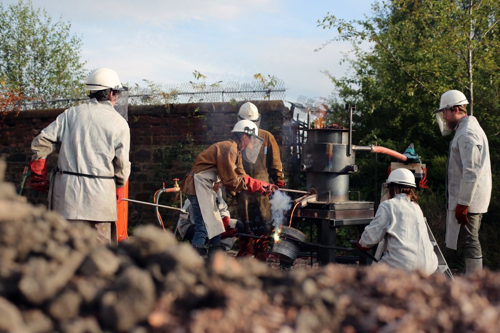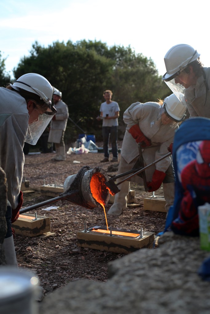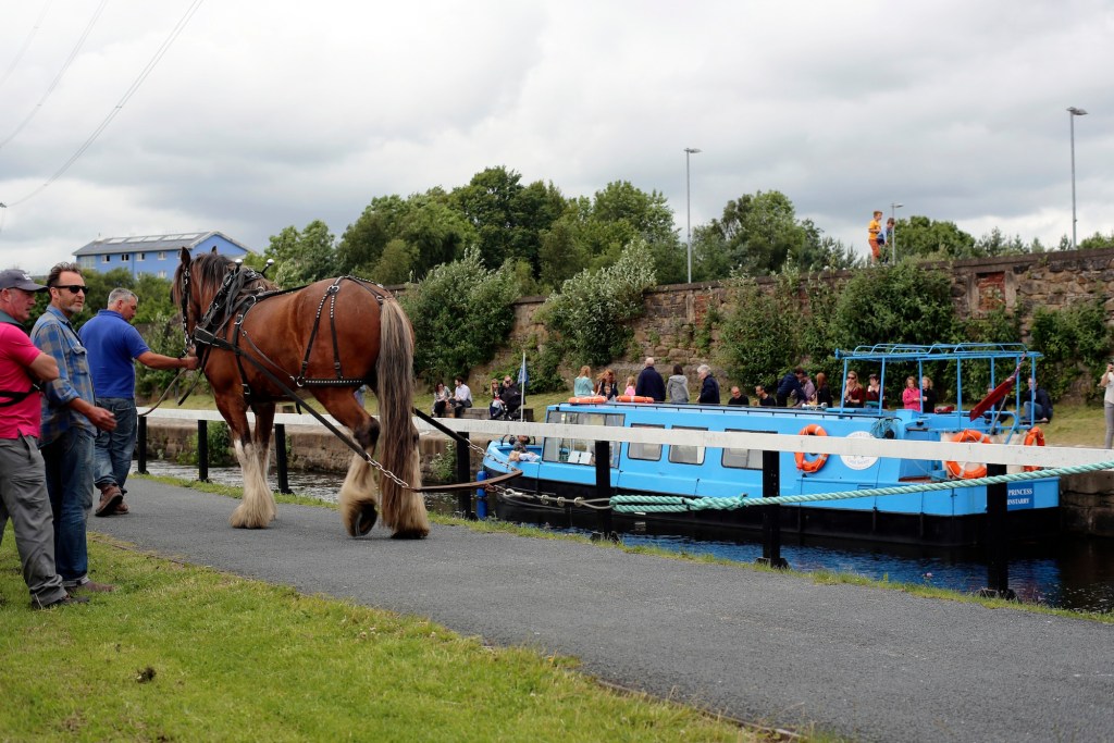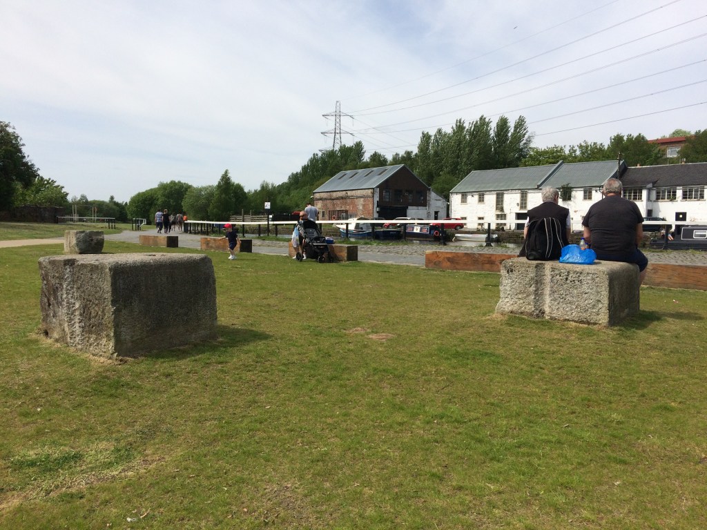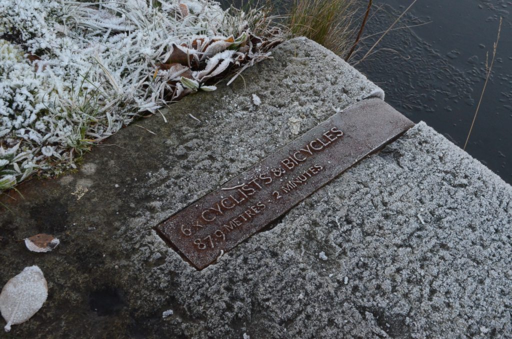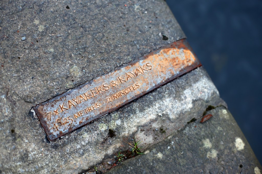 Displacement: Seven cast-iron ingots commemorating a barge-pulling event in July 2015, set into the stonework that edges the canal bank.